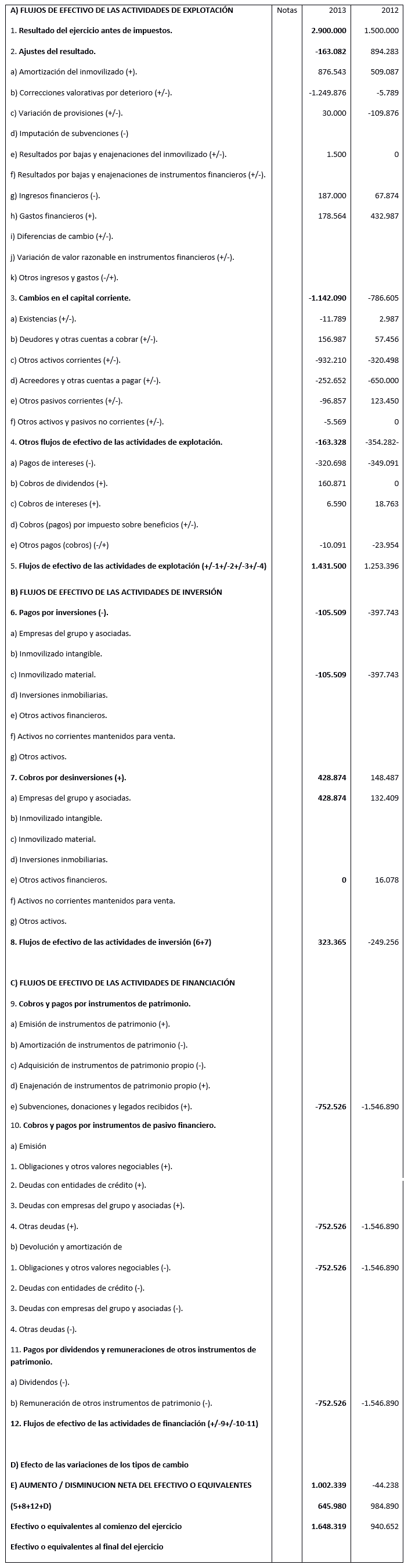 El modelo proporcionado en el Plan general Contable (BOE del 20/11/2007) para calcular este flujo de efectivo es este: