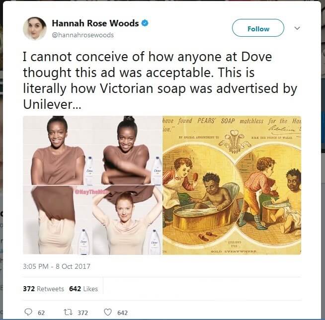 Según la compañía, el objetivo del anuncio, que se publicó en Facebook en Estados Unidos, era representar su política inclusiva, pero la secuencia en la que aparecen las modelos, en combinación con la imagen del jabón, puede interpretarse como que la piel oscura se puede “limpiar” hasta que se vea blanca. El efecto antes-después de la imagen transmite más bien que el aclaramiento de la piel supone una mejora. Nada ayuda que Unilever, el consorcio en el que se incluye Dove, publicara anuncios con un mensaje similar a finales del siglo XIX, cuando el racismo estaba socialmente aceptado, transmitiendo de forma explícita la idea de que la piel blanca es mejor y preferible. Este paralelismo en el formato visual ha levantado hoy dolorosas ampollas con connotaciones racistas, como señalaron algunas usuarias de Twitter: