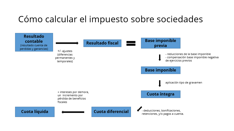Por lo tanto, el primer paso para conocer el importe del impuesto de sociedades es calcular la base imponible. Para ello, se parte del resultado obtenido de la cuenta de pérdidas y ganancias, al que se denomina resultado contable. Sin embargo, el cálculo de la base imponible se realiza a partir del resultado fiscal, y para obtenerlo se hace necesario realizar una serie de ajustes en el contable: a este se le suman o restan diferencias (permanentes o temporales) que terminarán resultando en la base imponible previa.
