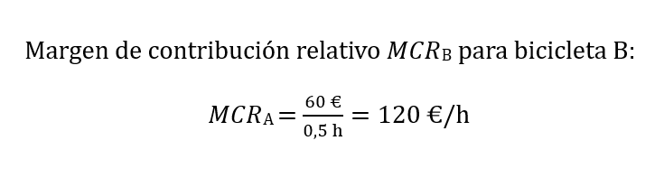 Ejemplo: el margen de contribución por unidad para el modelo de bicicleta A es de 100 euros. Su producción requiere el uso de una determinada máquina durante una hora. Sin embargo, el modelo de bicicleta B tiene un tiempo de producción de solo 30 minutos con la misma máquina y su margen de contribución por unidad es de 60 euros.