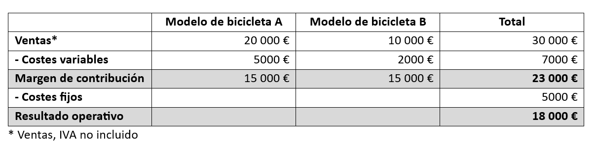 - Después resta los costes fijos del margen de contribución general para determinar el resultado operativo. En el ejemplo, el margen de contribución total es de 23 000 euros. Teniendo en cuenta los costes fijos por valor de 5000 euros, el resultado operativo sería de 18 000 euros.