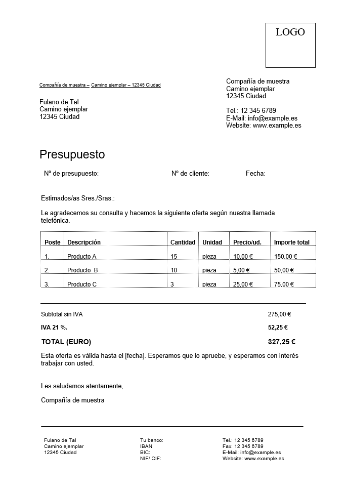 Nuestros ejemplos de presupuesto contienen todos los elementos fijos que no pueden faltar y que puedes ajustar en función de tus datos. Para que, al introducir valores numéricos no tengas problemas, hemos indicado cifras aleatorias en las casillas correspondientes. Sustitúyelas según convenga.