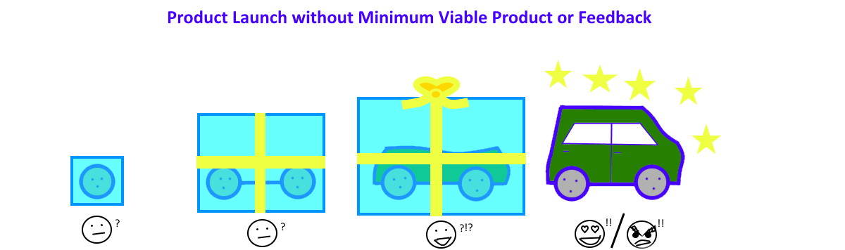 Con un esquema sencillo, Hendrik Kniberg mostró cómo este principio a menudo se malinterpreta o se usa de forma equivocada. La imagen que viene a continuación ilustra un proceso de desarrollo en el que el MVP ha sido usado erróneamente. Cada dibujo, de izquierda a derecha, simboliza una nueva versión del producto que sale al mercado. Los emoticonos en la parte inferior de la imagen representan la reacción del consumidor. El producto final es un coche. Con el vehículo, el desarrollador debe satisfacer una necesidad concreta del consumidor.