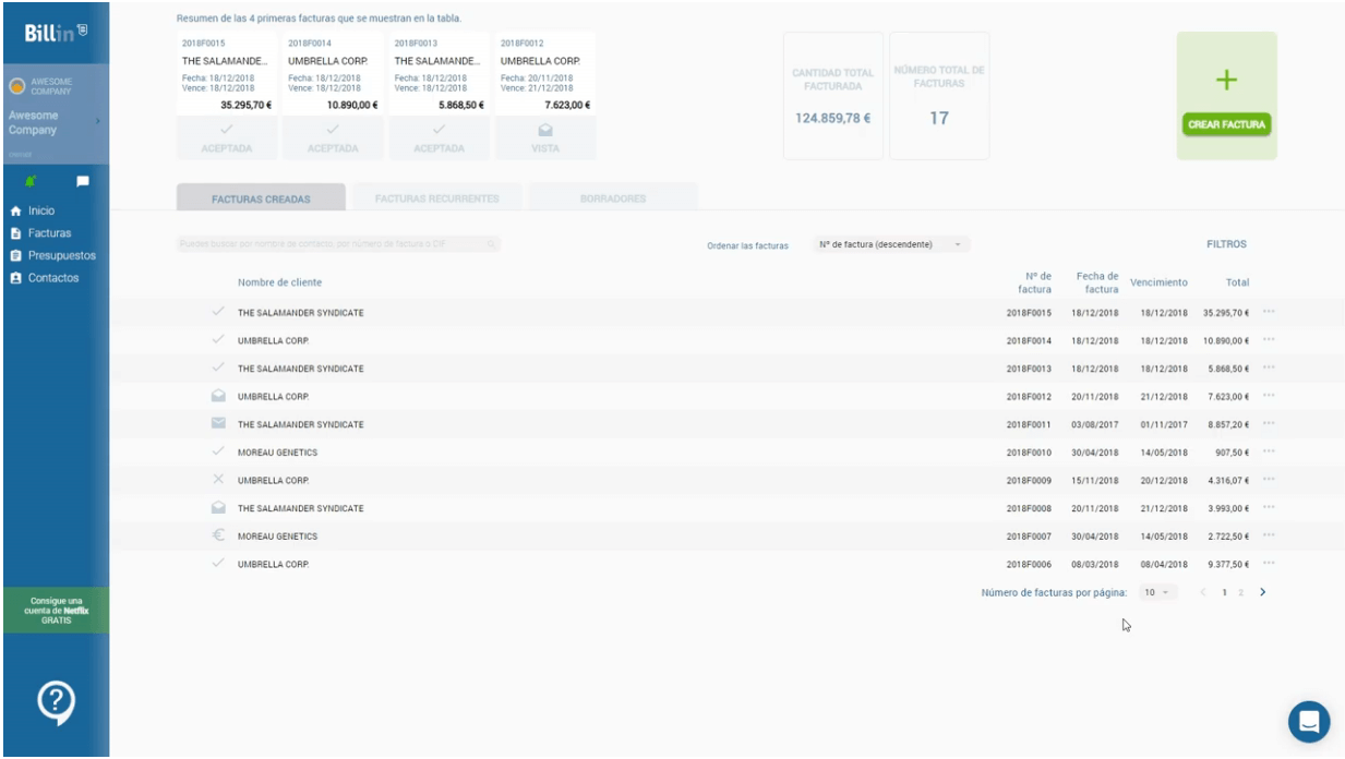 Entre otras funciones interesantes, Billin te permite usar filtros para gestionar las facturas más fácilmente, así como personalizarlas para añadir tu logo, tus colores corporativos y tus mensajes.