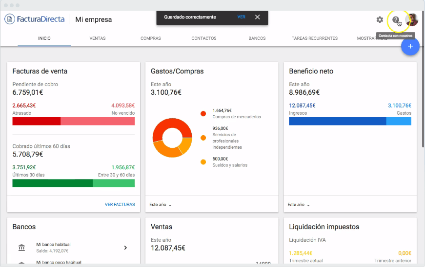 Otro de los programas para facturar líder en España es Contasimple, diseñado especialmente para autónomos y empresas con el objetivo de facilitar los procesos de facturación, contabilidad y cálculo de impuestos. Contasimple es un programa perfecto para usuarios sin conocimientos contables previos pues el sistema te guía paso a paso en todas las operaciones y, en caso de duda, puedes contactar telefónicamente a su servicio de atención al cliente para que te ayude.