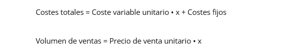 Para averiguar el número de unidades x del umbral de rentabilidad estas dos ecuaciones deben igualarse y luego se calcula la x:
