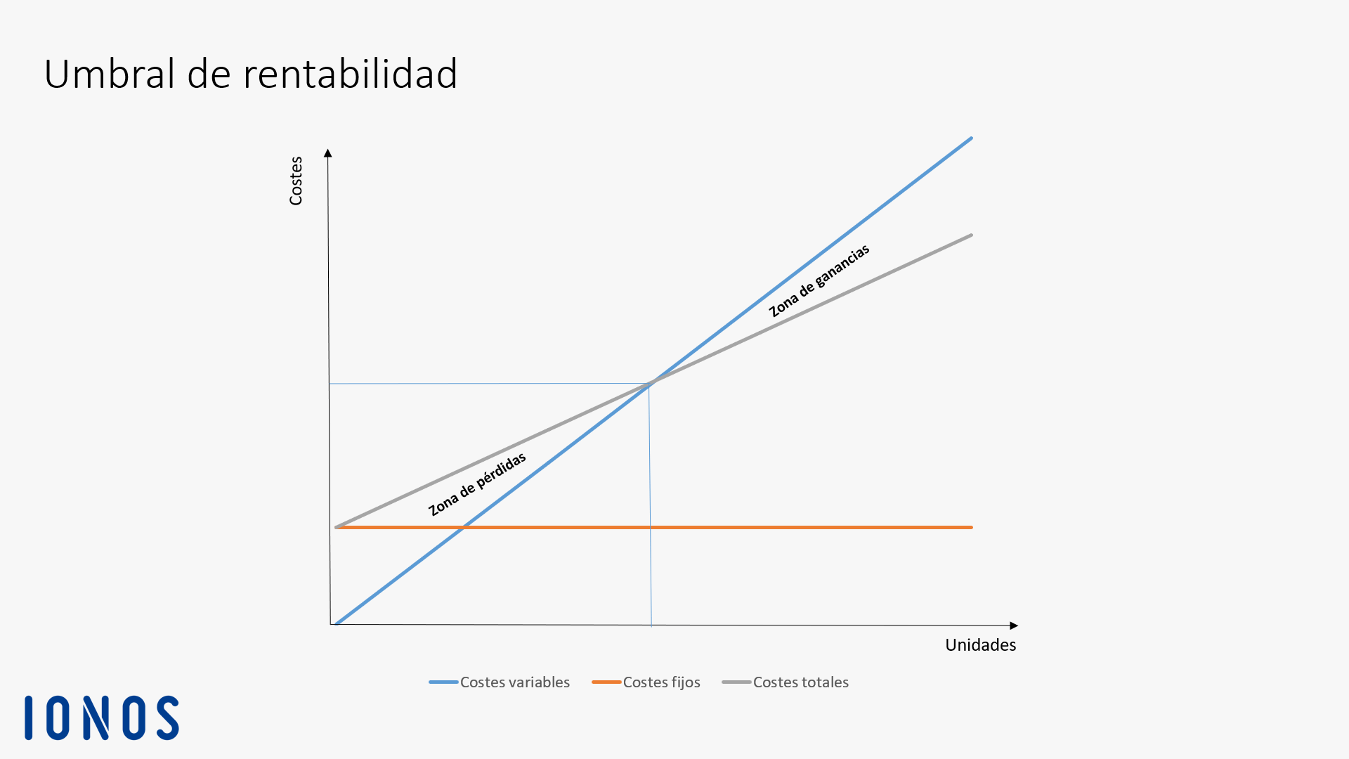 El umbral de rentabilidad aparece en el diagrama en el punto de la intersección de la curva de volumen de ventas y la curva de costes totales. En este punto los costes totales tienen el mismo valor que el volumen de ventas; la empresa no sufre ni pérdidas ni ganancias. Si se venden más productos, la empresa entra en la zona de ganancias. Si disminuyen las ventas, pasa a la zona de pérdidas.
