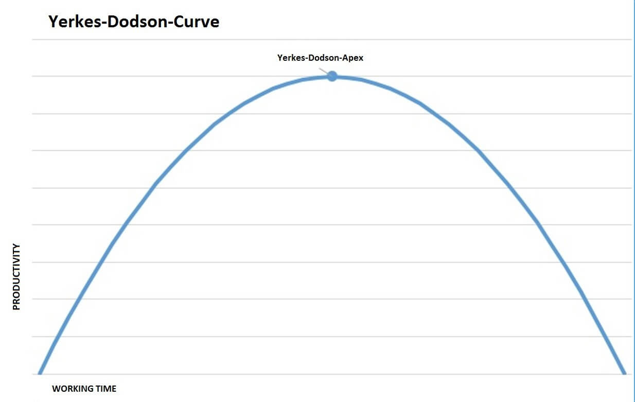 De forma parecida a la Ley de Pareto, la ley de Yerkes-Dodson también describe la relación entre la activación o el esfuerzo y el rendimiento. Toma el nombre de los psicólogos Robert Yerkes y John Dodson, cuyas investigaciones concluyeron que la productividad mejora con una activación mayor, aunque solo hasta el punto óptimo de rendimiento. Este punto, el ápice de la “U” invertida o curva de Yerkes-Dodson es donde un aumento de la presión acarrea una reducción de la productividad.