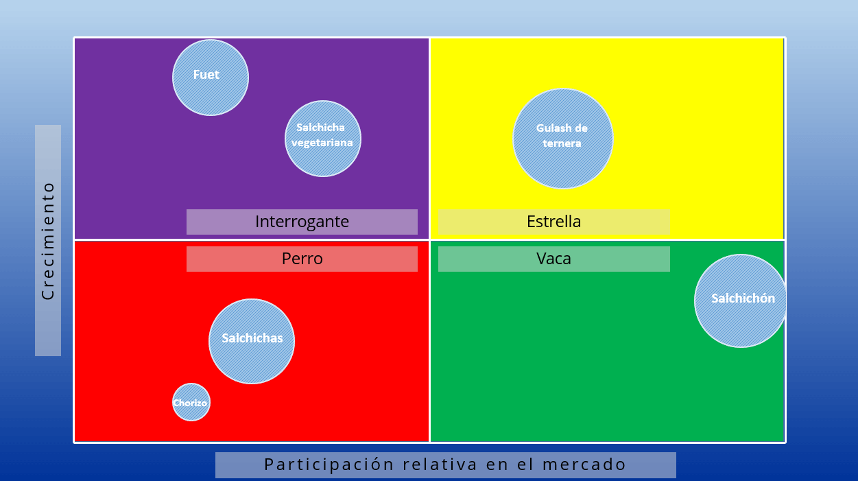 Para nuestro ejemplo realizaremos un análisis con matriz BCG de la empresa ficticia Charcutería Ramírez. A la propietaria de la empresa le gustaría evaluar su gama de mercancías con ayuda de una matriz Boston Consulting Group con el fin de desarrollar estrategias estables a largo plazo. En la actualidad la empresa mantiene seis productos en el mercado: goulash de ternera, salchichas, chorizo, salchichón, fuet y salchicha vegetariana. Pero nuestra charcutería tiene dos rivales directos: Delicat y Exquisite.