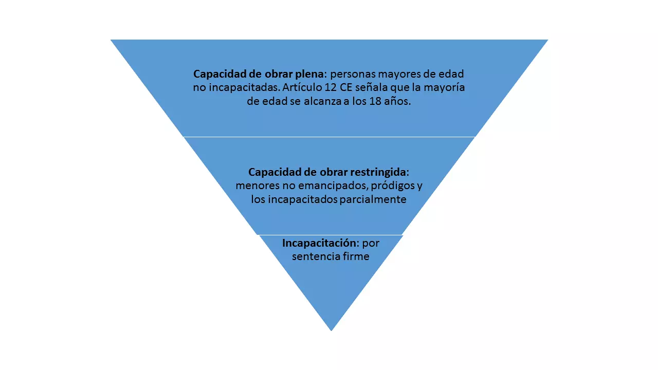 Como ya se ha dicho, todas las personas físicas tienen capacidad jurídica desde su nacimiento, pero según el Código Civil español, se distinguen tres niveles diferentes de capacidad de obrar, en función de la edad y la salud mental: